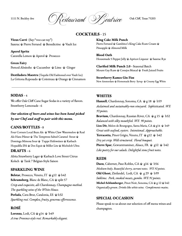 Step into the vibrant world of Restaurant Beatrice, where Louisiana-inspired cuisine takes center stage. Located at 1111 N Beckley Ave, Dallas, TX, this culinary gem offers a menu that celebrates regional flavors with a flair of creativity.